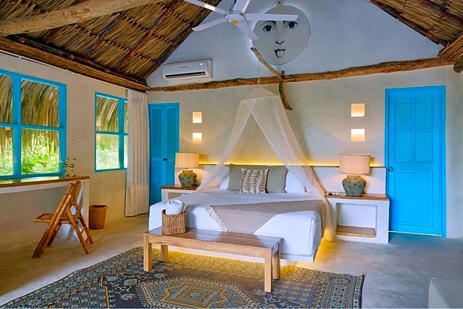 BUNGALOW DELUXE is 700 square feet and includes a king-size bed 150-183 width plus rollaways on demand plus living room, balcony, and extra beds on demand.